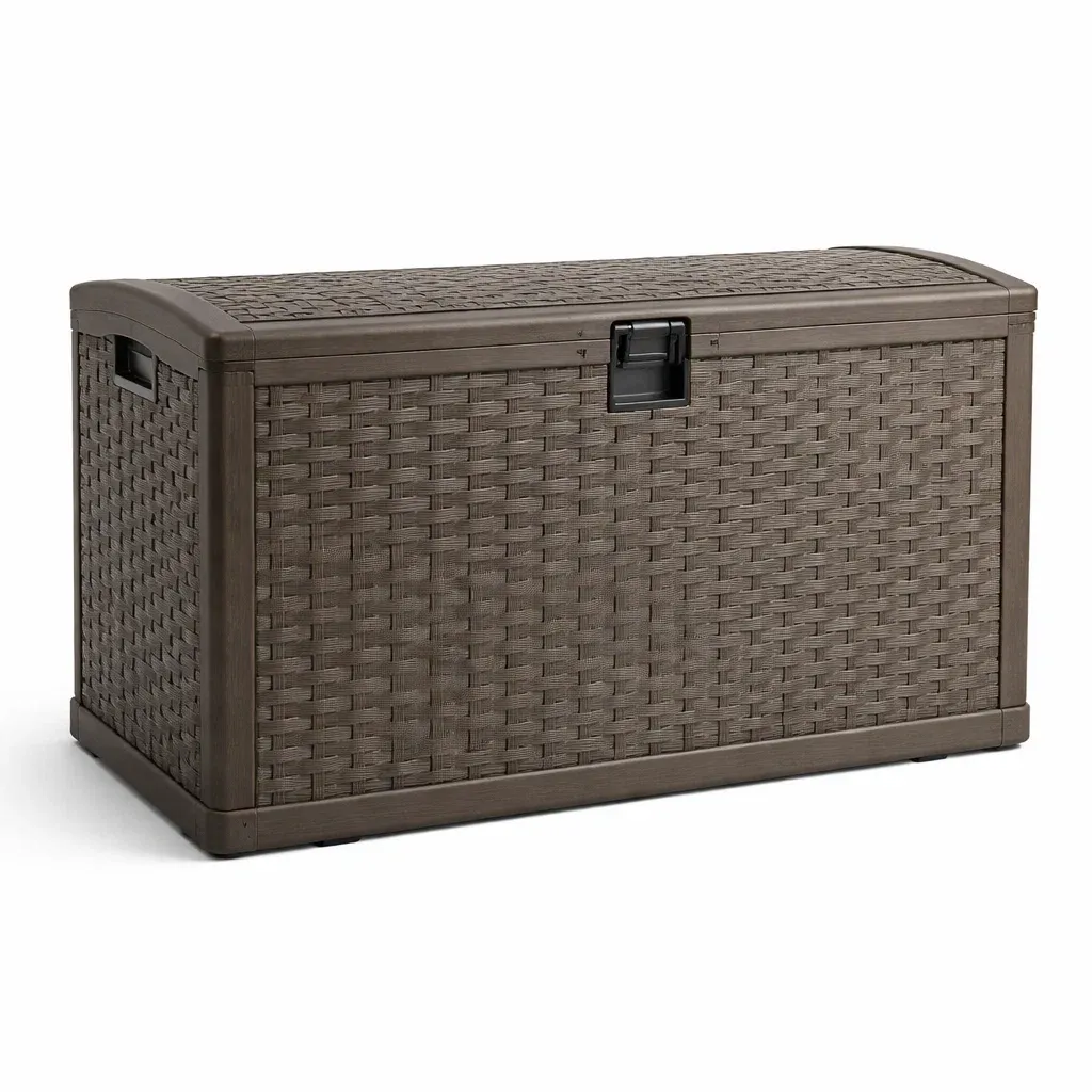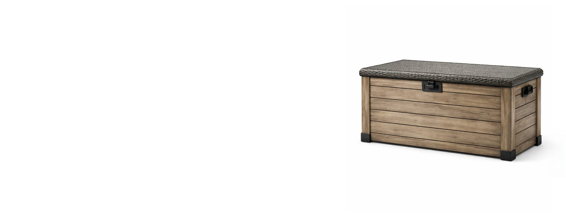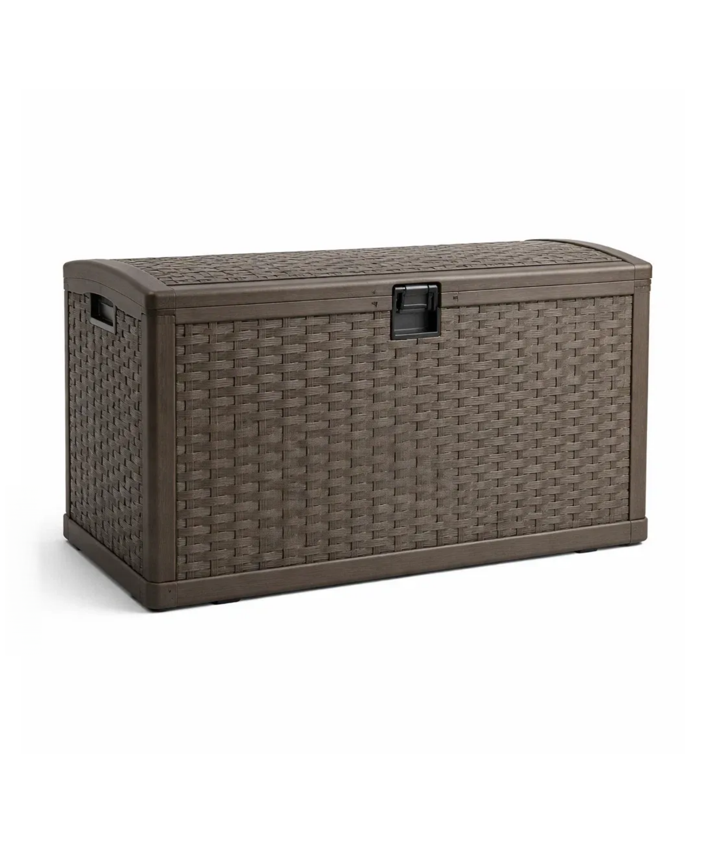 Coffre de rangement polyvalent pouvant accueillir des outils de jardinage, des coussins ou des articles ménagers, adapté à différents environnements.