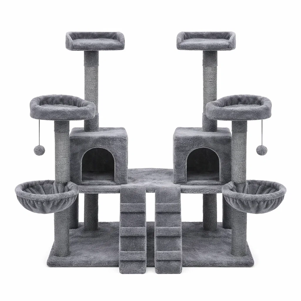 Structure : Comprend 2 cabanes, plusieurs perchoirs et espaces de repos