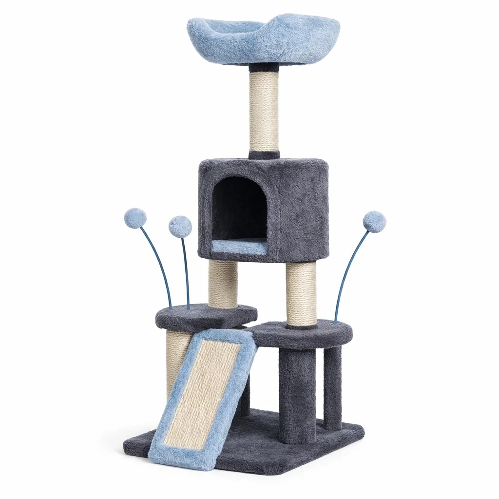 Structure multi-niveaux avec plateformes, fabriquée en sisal et peluche douce. Comprend des poteaux recouverts de sisal et des balles de jeu suspendues. Dimensions : 130 cm de hauteur. Poids : 8.5 kg.