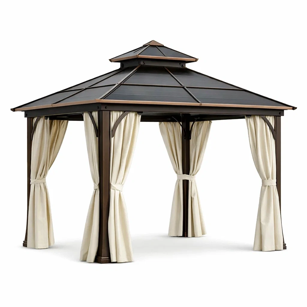 Matériau : Structure en aluminium, toit en acier galvanisé, rideaux en polyester.